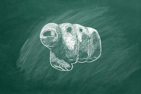 A human hand pointing and gesturing towards to you. Closeup of a human hand pointing at you. Illustration drawn in chalk on a green chalkboard.
