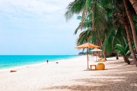 A tropical beach with palm trees and white sand. Travel and tourism.
