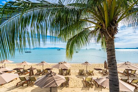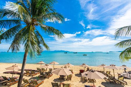Beautiful tropical beach sea and ocean with coconut palm tree and umbrella and chair on blue sky and white cloud for holiday vacation travel