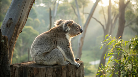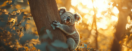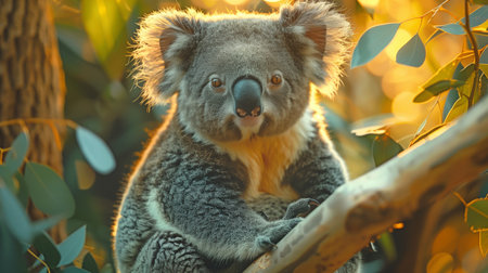 Adorable koala sitting on tree branch with soft sunlight in background