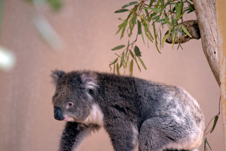 A cute koala bear, disambiguation or Phascolarctos cinereus, relaxing on eucalyptus tree with green leafs in the zoo, Australia.