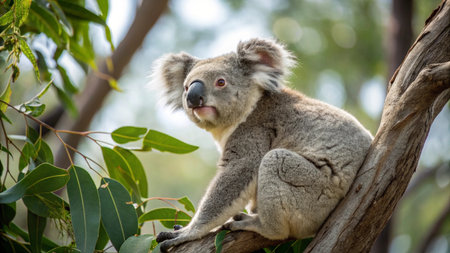 A cute koala sits comfortably on a tree branch amidst lush eucalyptus leaves, embodying the charm of Australian wildlife in its natural environment.