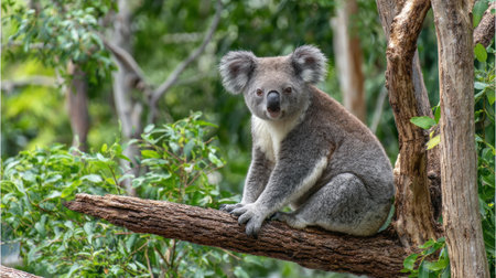 A charming koala poses on a sturdy tree branch, surrounded by vibrant green foliage. This image captures the serene beauty of wildlife, showcasing the koala's soft fur and inquisitive expression in its natural habitat.