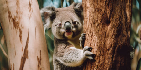 A koala bear climbing an eucalyptus tree in a forest. AI generative image.