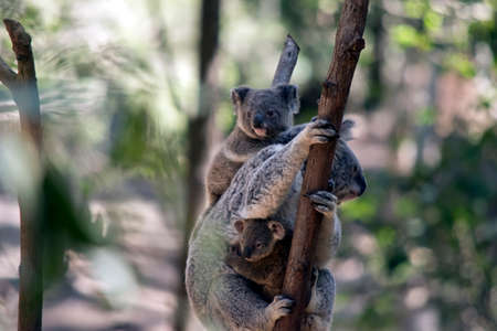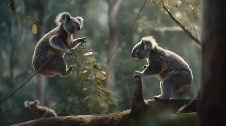 charming portrait of koala family, including mother and father, clambering through the trees, created with generative ai