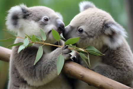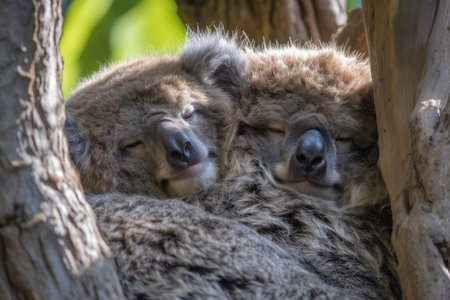 pair of koalas resting in the shade of their eucalyptus tree after a long day, created with generative ai