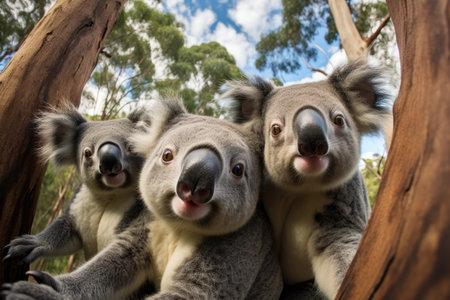 Amusing Group Of Koalas Taking Selfie Photorealism. Concept Wildlife Safari, Majestic Lions, Lush Green Landscapes, Stunning Bird Species, Hidden Waterfall Retreat.