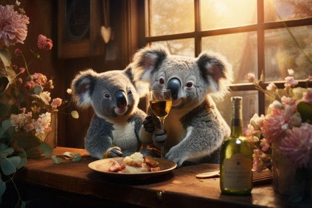 Two koalas drinking champagne and eating a slice of apple on the table.