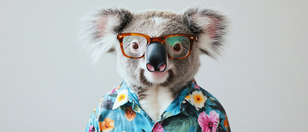 Koala wearing glasses and floral shirt, posing against a plain white background, cute and quirky