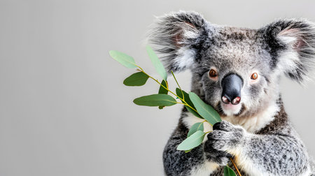 Cute and Cuddly Koala Bear Holding Out a Sprig of Fresh Eucalyptus Leaves on a Neutral Gray Background with Copy Space