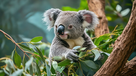 A charming koala rests comfortably on a tree branch, showcasing its fluffy fur and captivating eyes. This peaceful image captures the essence of wildlife conservation in Australia.