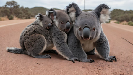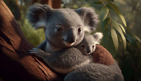 In the heart of an Australian park, under the golden rays of a sunny day, two playful koalas engage in a gentle embrace amidst the lush greenery Their fluffy gray fur melds with the vibrant foliage as they cling to sturdy branches, their expressions exuding a sense of contentment and tranquility AI Generative