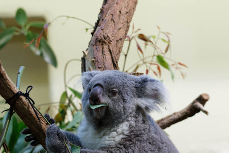 Adorable Koala Bear Close-up, Expressive Face with Soft Fur, Enjoying Fresh Eucalyptus Leaves