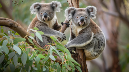 Two koalas are perched on a tree branch, resting comfortably. The iconic Australian marsupials are observed in their natural habitat, displaying their characteristic behavior.