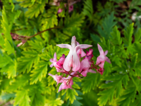 Macro shot of the opened and long shaped cluster of pink flowers of flowering plant wild or fringed bleeding-heart, turkey-corn (Dicentra eximia) with oddly shaped flowers in the garden