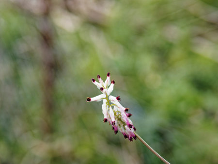Close-up of Fumaria capreolata, the white ramping fumitory, flower on a blurred background