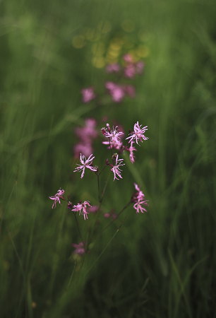 Delicate pink ragged robin flowers sway gently, bathed in soft light.