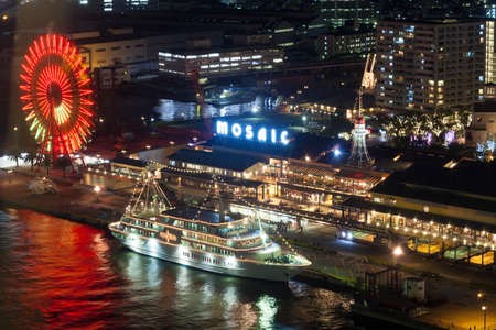 night city, view from the top at Osaka bay area at night with city light, bridge and attractions