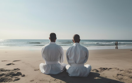 A fighters state of mind. Rearview shot of two unrecognizable martial artists meditating while practicing karate on the beach.