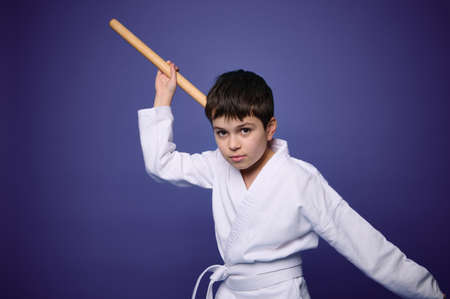 Confident charming European aikido wrestler poses with wooden weapon during Oriental martial arts practice, isolated on violet background, copy ad space for text. Oriental martial arts practice