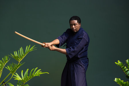 Handsome black martial artist man with martial arts costume of kendo