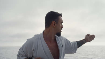 Focused athlete practicing powerful karate punches at sunset outdoor close up. Bearded middle age sportsman making fighting attack wearing kimono near sea waves. Strong man training martial arts.