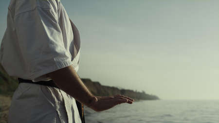 Unknown karate master honing fighting exercises on seashore close up. Athletic man training meditating technique outdoor at sunset. Strong sportsman hands practicing martial arts on nature.