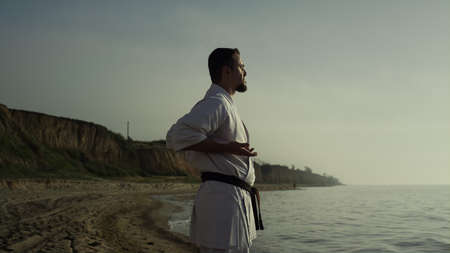 Sporty man practicing karate fighting standing beach under gray sky. Focused sportsman training martial technique cloudy morning outdoors. Bearded athlete workout wearing kimono with black belt.