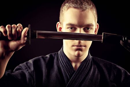 Handsome young man practicing kendo Over dark background