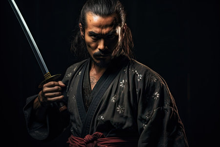 Katana sword master in dojo holding sharp sword in his hand. Man wearing traditional clothes preparing for the fight. Generative AI