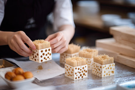 A chef arranges food within decorative containers on a clean surface. The image showcases neutral tones, with warm lighting highlighting the subject. The composition suggests an indoor environment. Suitable for commercial projects or editorial content relating to food preparation and presentation.