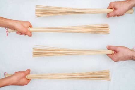 Top view of bamboo brooms in hands of two masseurs on white background.