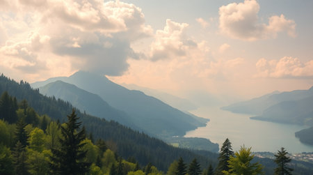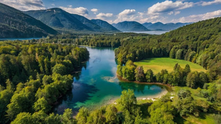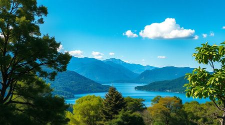 A serene lake surrounded by mountains and lush forests, reflecting the sky and trees.