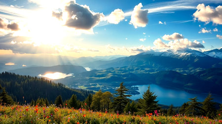 Panoramic view of beautiful alpine meadow with wildflowers at sunset