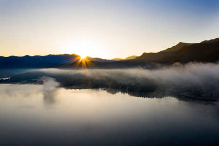 Morning mist on the mountain lake. Beautiful nature scene in Switzerland.
