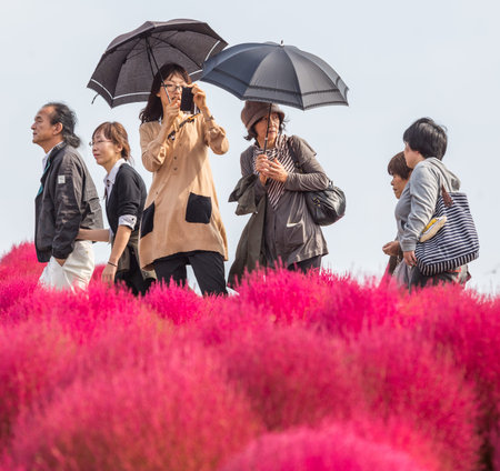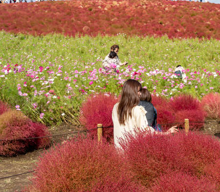 HITACHI SEASIDE PARK, JAPAN - 24TH OCTOBER 2015. Crowd of tourists enjoying the view of red kochia bushes. Hitachi Seaside Park is a popular tourist destination in Japan.