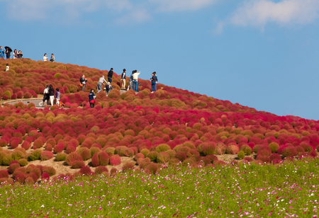 Beautiful kochias hill in autumn season at Hitachi seaside park , October 30, 2016, Ibaraki prefecture , Japan