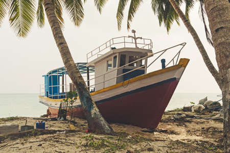 Shipwreck on a Beach. Large fishing boat on the sand on the beach under palm trees on the Indian island. The boat is under repair at the dock.