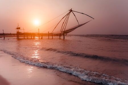 Chinese fishing nets form the backdrop in the waters edge of river at Kochi beach in Kerala
