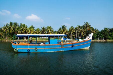 Kollam, India - 20 January 2015: Fishing boat on the river near Kollam on Kerala backwaters, India
