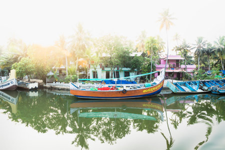 Ocean fishing boat with lens flare along the canal Kerala backwaters shore with palm trees at a sunny day between Alappuzha and Kollam, India