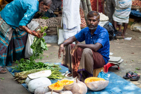 Bangladesh, Rangpur- August 31, 2021. A poor man is sitting in a makeshift shop in the market and is selling different kinds of vegetables there. the background blur