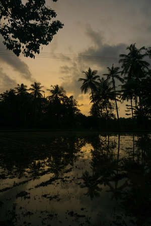 Dusk over the inland waterways of the Kerala backwaters, a network of brackish lagoons and lakes lying parallel to the Malabar Coast the state of Kerala in southern India.