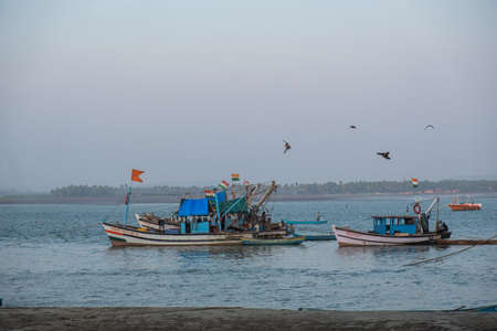 Sindhudurg, INDIA - December 23, 2021 : Troller type fishing boat at coastal maharashtra region. Sindhudurg district listed in 30 favorite tourist destination around the world.