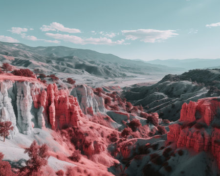 an infrared image of red rock formations in the desert