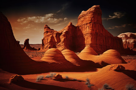 sandstone red rock formations of desert in shadows against backdrop of sky, created with generative ai