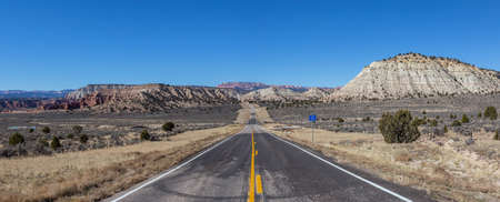 Scenic road in the desert during a vibrant sunny day. Taken on Route 12, Utah, United States of America.