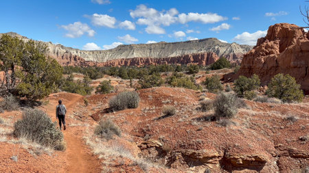 Female hiker walking a scenic desert trail in Kodachrome Basin State Park, Utah. She enjoys the sunshine and the beautiful red rock cliff views on a bright and sunny day - Utah