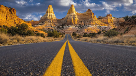 A yellow line on the asphalt of an American desert road, with red rock formations in the background. --chaos 30 --ar 16:9 --v 6.1 Job ID: 793cee04-6b4c-4afc-a59e-44ce36f0eb86