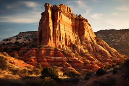 an orange mountain stands tall against the sky, showcasing fine lines, delicate curves, and intense lighting and shadow. the organic stone carvings on its eroded surfaces add a unique touch. captured with a high-resolution ricoh ff-9d camera, the vibrant red and azure colors create a visually striking composition. ai generated
